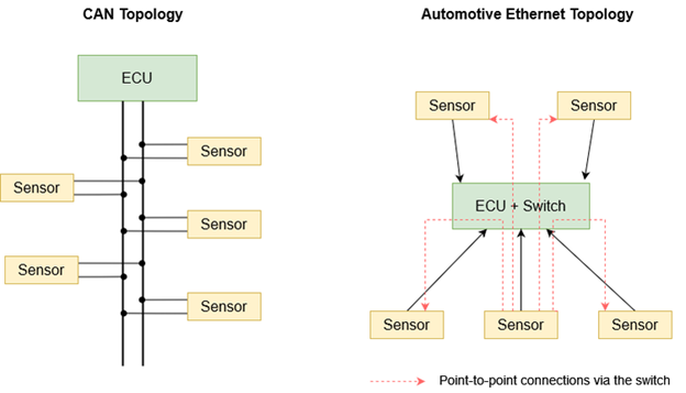 - Network topology: CAN has a bus topology. In a subsystem, each node is connected to its two-wire CAN bus through two wires. A vehicle has multiple CANs to handle different subsystems, such as a powertrain CAN. In contrast, automotive Ethernet is a star topology that connects nodes through Ethernet switches, but any pair of nodes can effectively talk like a point-to-point connection. However, 10BASE-T1S offers both a multi-drop bus mode that works like CAN and a point-to-point mode.